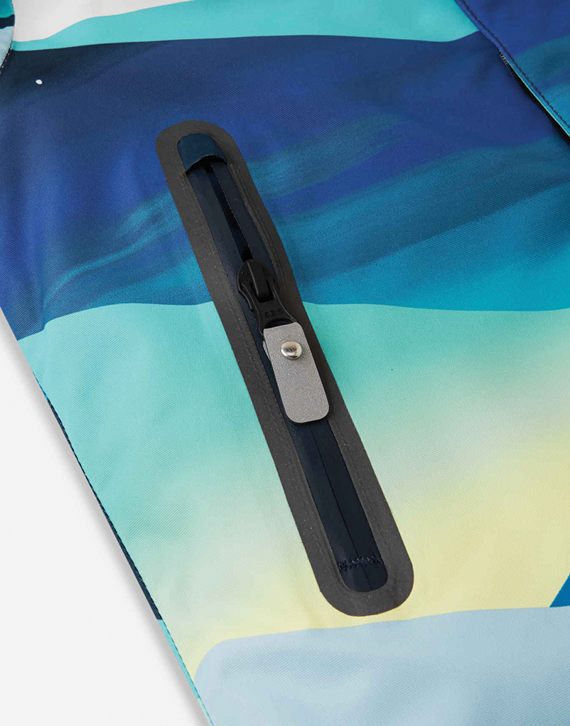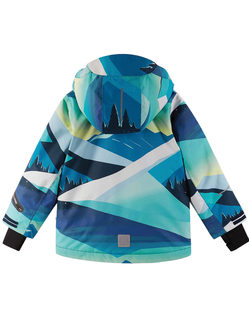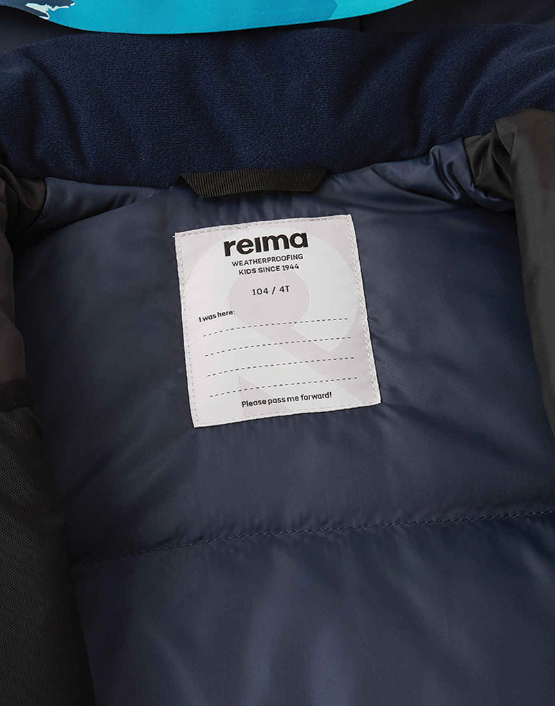 All seams sealed waterproof Durable material Smooth polyester lining Safe, detachable and adjustable hood Adjustable cuffs and elastic inner cuffs Ski helmet-compatible hood from 104 cm onwards Goggle pocket Inner chest pocket with zip from size 116 onward Water-repellent pocket zips Ski pass pocket on sleeve with Reima branded water-repellent zip Adjustable hem, adjustable detachable snow lock at waist |