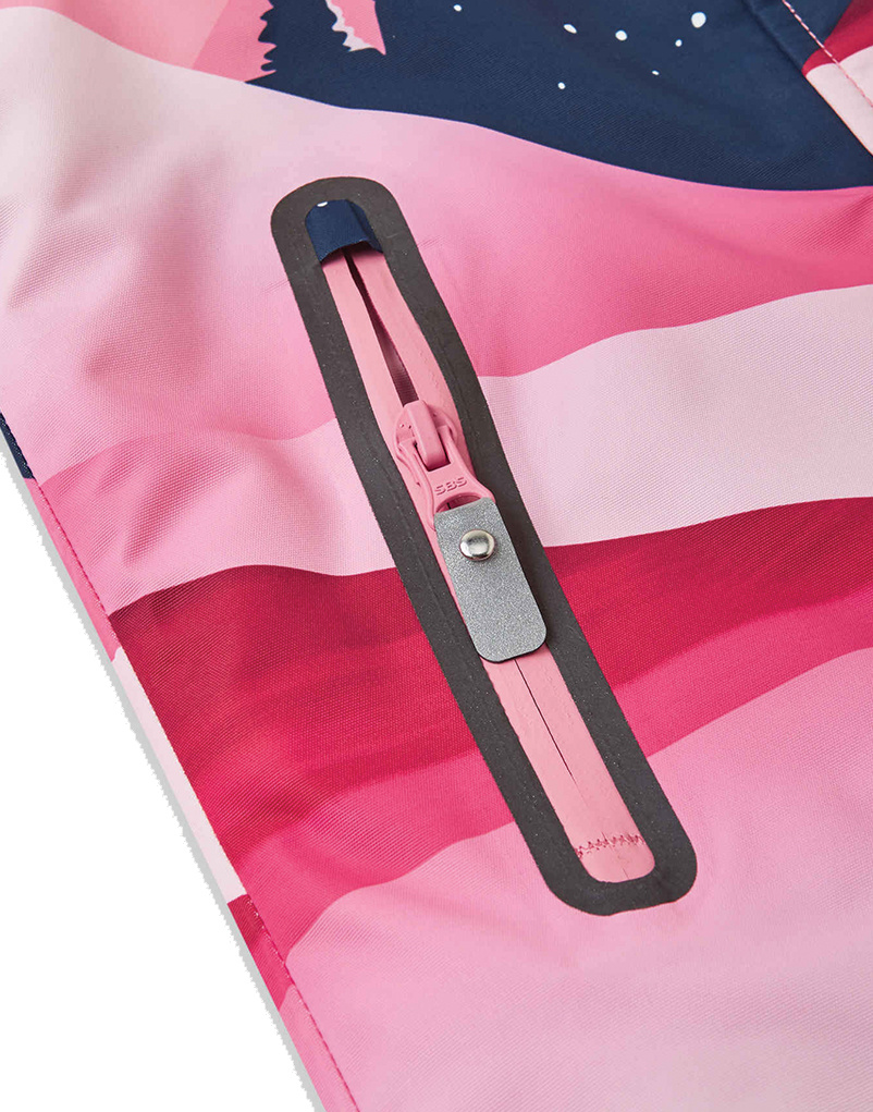 All seams sealed waterproof Durable material Smooth polyester lining Safe, detachable and adjustable hood Adjustable cuffs and elastic inner cuffs with thumb holes Goggle pocket Inner chest pocket with zip from size 116 onward Water-repellent pocket zips Ski pass pocket on sleeve with Reima branded water-repellent zip Adjustable hem, adjustable snow lock at waist |