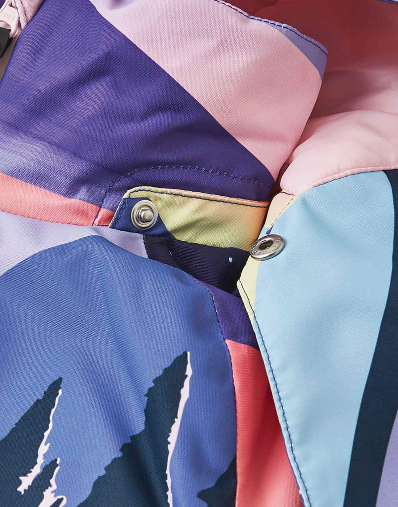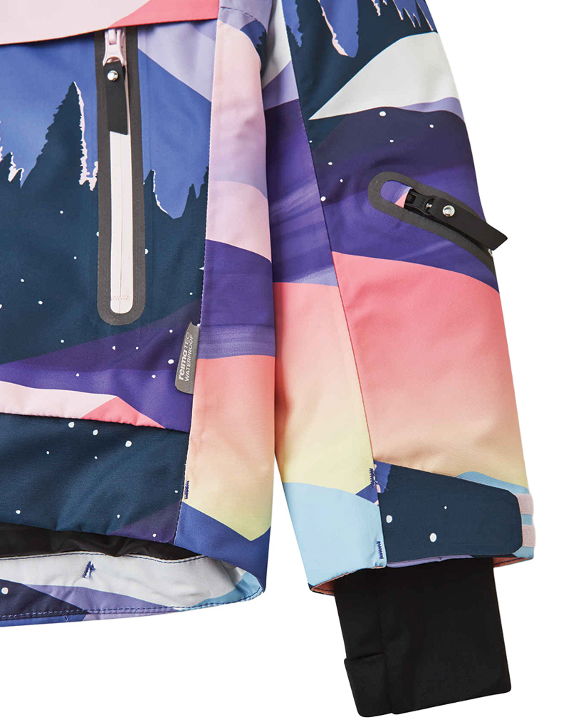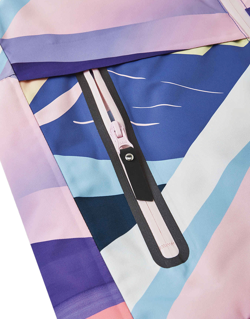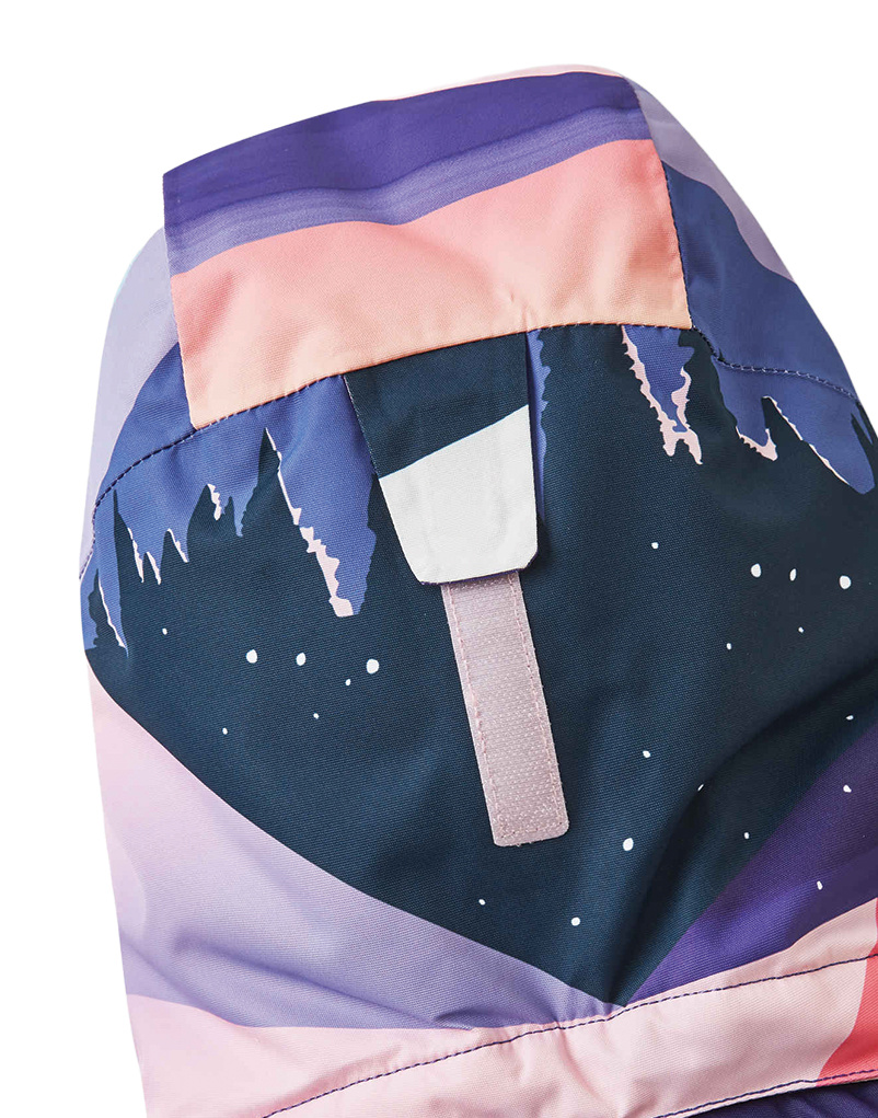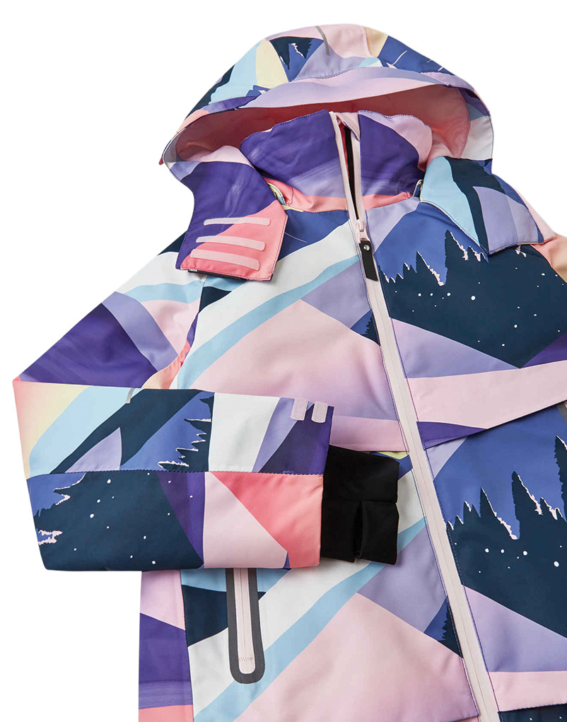 All seams sealed waterproof Durable material Jacket and pants connector in snow lock Shaped cut | Safe, detachable and adjustable hood Ski helmet-compatible hood Adjustable cuffs and elastic inner cuffs with thumb holes Inner chest pocket with zip from size 116 onward Water-repellent front and pocket zips for improved protection Ski pass pocket on sleeve with Reima branded water-repellent zip Goggle pocket Adjustable hem, adjustable detachable snow lock at waist |