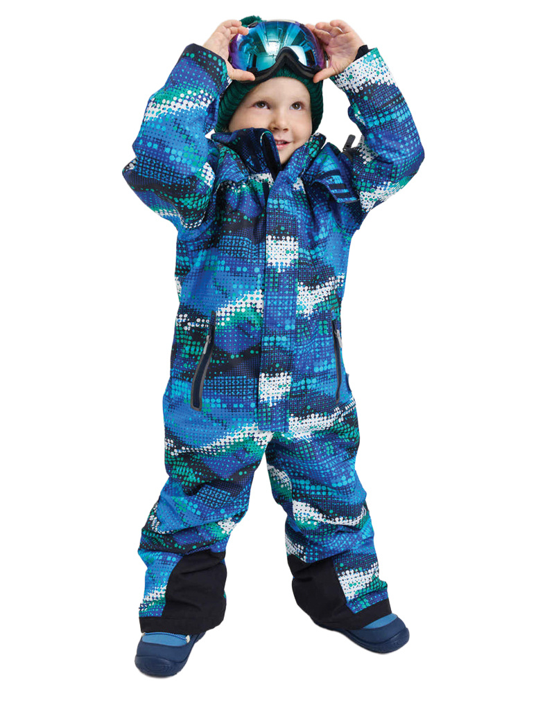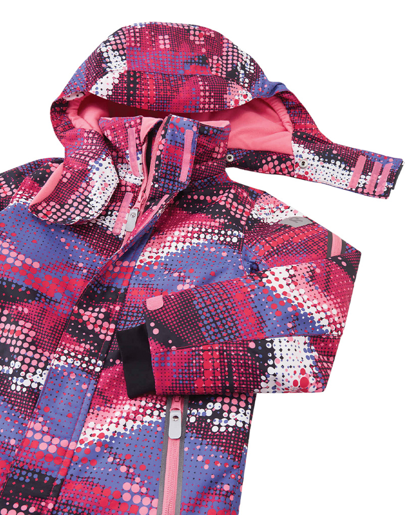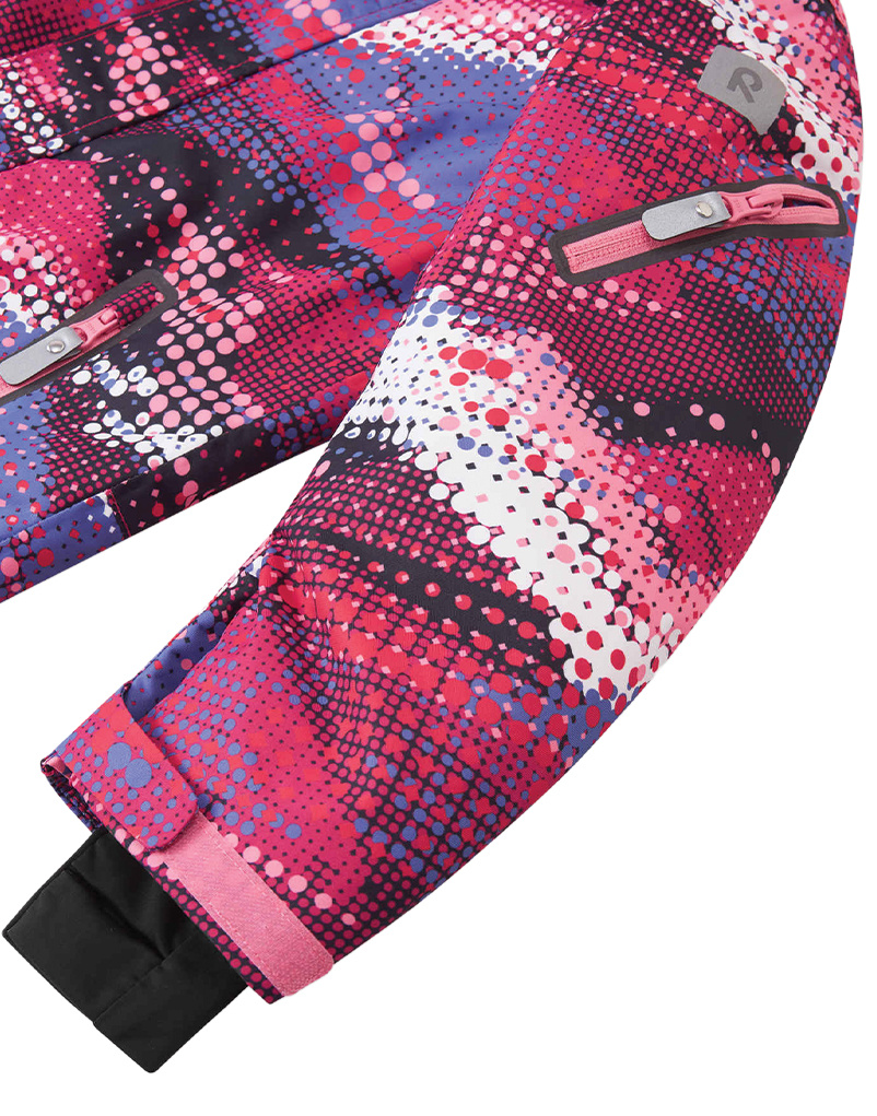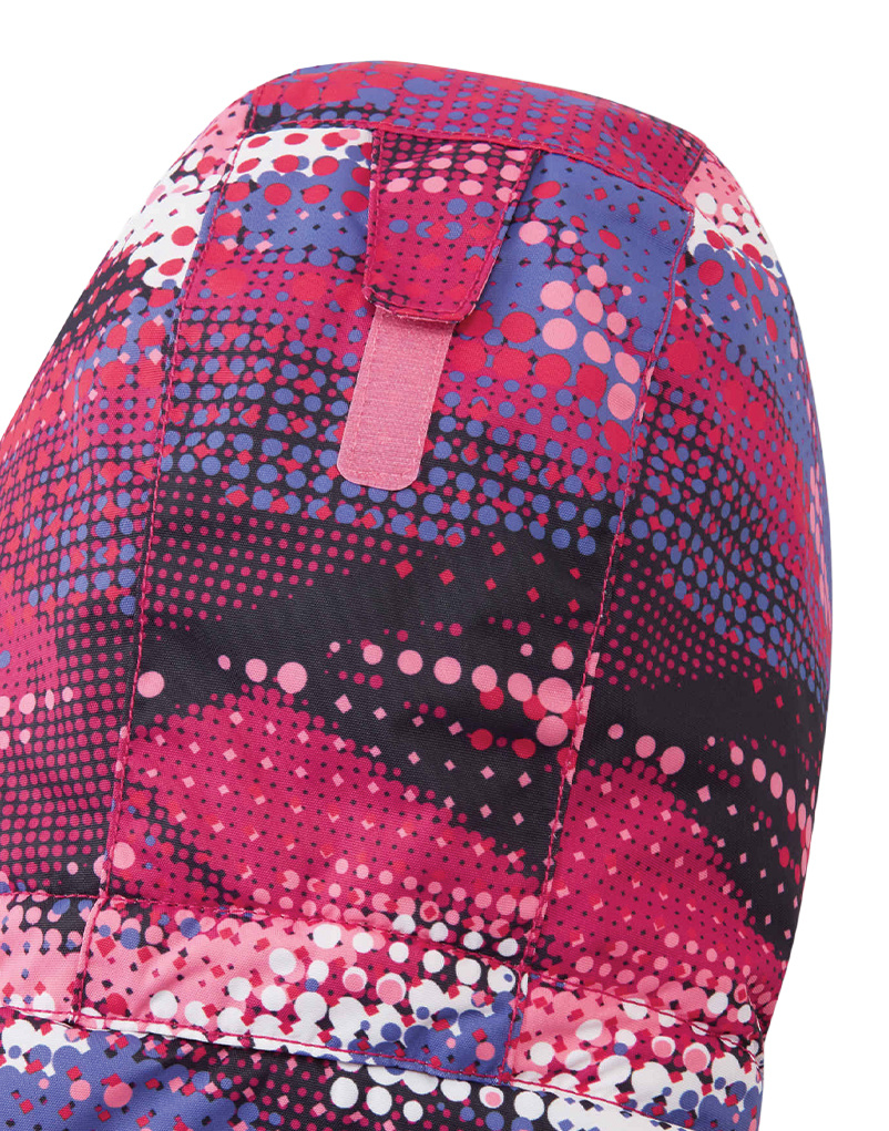 All seams sealed waterproof Durable material Very durable reinforcements Workman cut Smooth polyester lining Safe, detachable and adjustable hood Ski helmet-compatible hood from 104 cm onwards Adjustable cuffs and elastic inner cuffs with thumb holes Zip pockets, ski pass pocket on sleeve Adjustable waist Adjustable snow locks at leg ends To keep the leg end up, snap it to the snow lock |