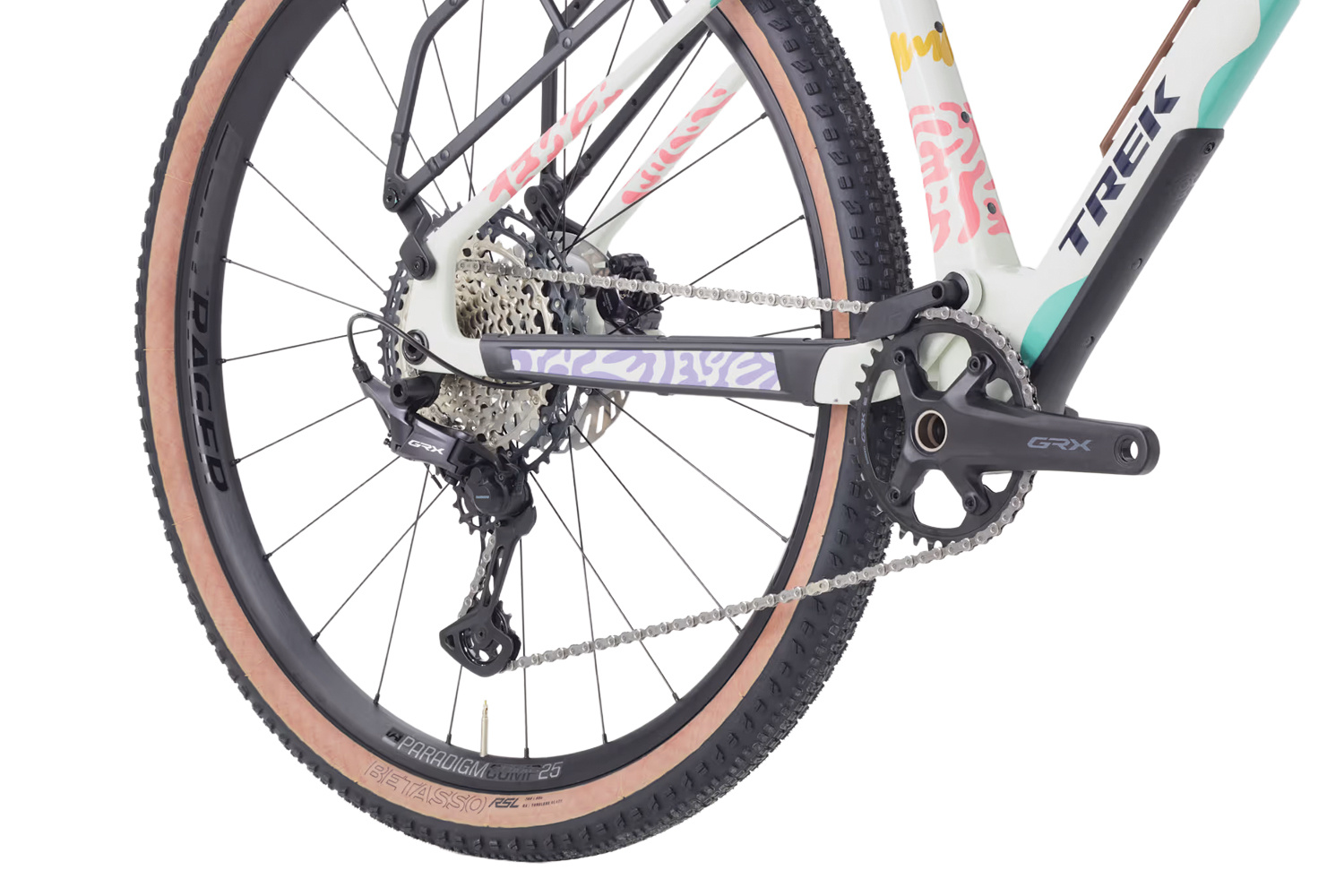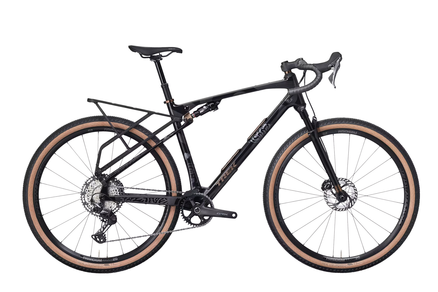 Wheel Front: Bontrager Paradigm Comp 25, Tubeless Ready, 25 mm rim width, 100x12 mm thru axle Wheel Rear: Bontrager Paradigm Comp 25, Tubeless Ready, 25mm rim width, SRAM XD-R 12-speed freehub, 142x12 thru axle Skewer Rear: Bontrager Switch chamfered thru axle, removable lever Tire: Bontrager Betasso RSL GX, Tubeless ready, aramid bead, 60 tpi, 700x50mm Tire Part: Bontrager TLR sealant, 180 ml/6 oz Rim Strip: Bontrager TLR Max Tire Size: 56mm/2.20" (as measured, see manual for details) |