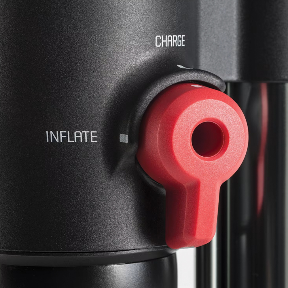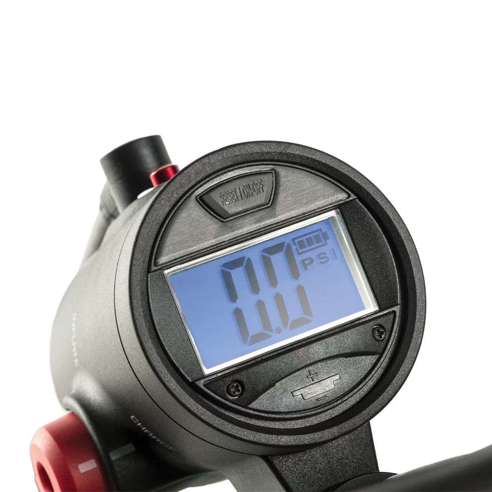 Dual-chamber design with Inflate setting allows for efficient use as a traditional floor pump Set to Charge for a pressurized chamber that inflates tubeless ready (TLR) tires without a compressor Digital gauge provides easy-to-read accuracy up to 160 PSI (recommended maximum) Compatible with both Presta and Schrader valves Included inflation accessories conveniently stored in handle Displays battery life of included CR2032 battery when powered on |