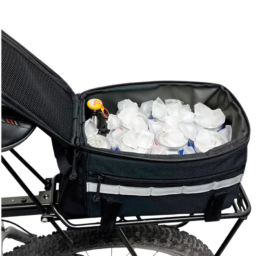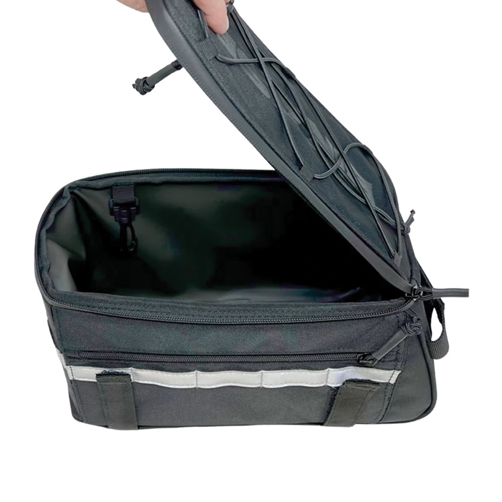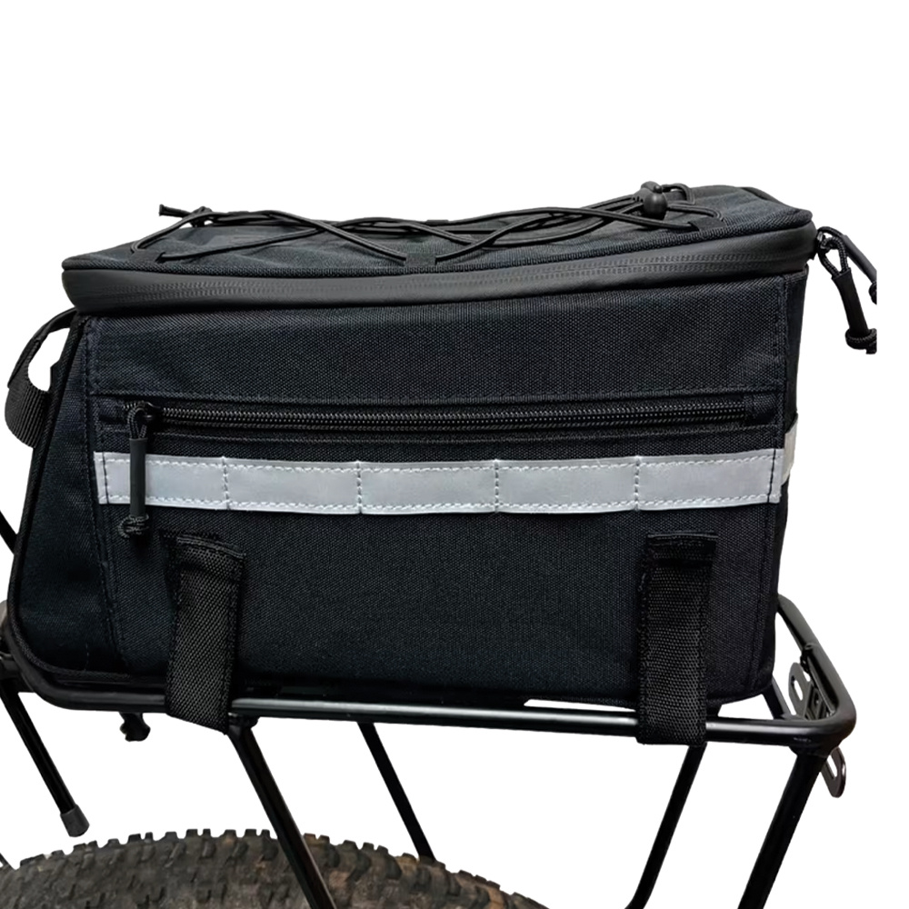 Designed to fit most racks Top mesh pocket and side zipper pockets Handle for easy carrying Bungee net on top for added storage Reflective accents for enhanced visibility |