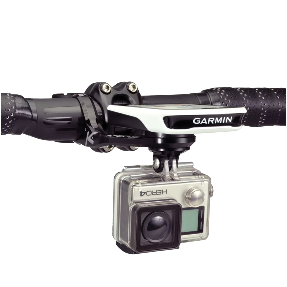 CNC machined aluminum anodized black with laser etched logos Compatible with all Garmin cycling computers, including Edge 1050 Includes combo mount below computer for use with cameras or lights with GoPro style interface For use with 31.8mm diameter handlebars Hinge design for simple mounting Payload capacity: Top – 161g, Bottom – 242g (e.g. NiteRider 1800 or Cycliq Fly12) Garmin approved replaceable computer insert designed to break in crash to protect computer tabs Weight: 64g, made in USA |