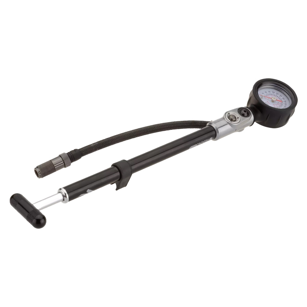 Two-stage head to seal off the Schrader valve first, then remove the head from the shock to prevent air loss. Micro air bleed for setting the perfect pressure. Super-flexible, high-pressure shock-oil-resistant hose. Compact design for easy storage in hydration packs. Comfortable T-handle. Max pressure: 300 PSI (20.7bar) Volume-per-stroke: 11cc |