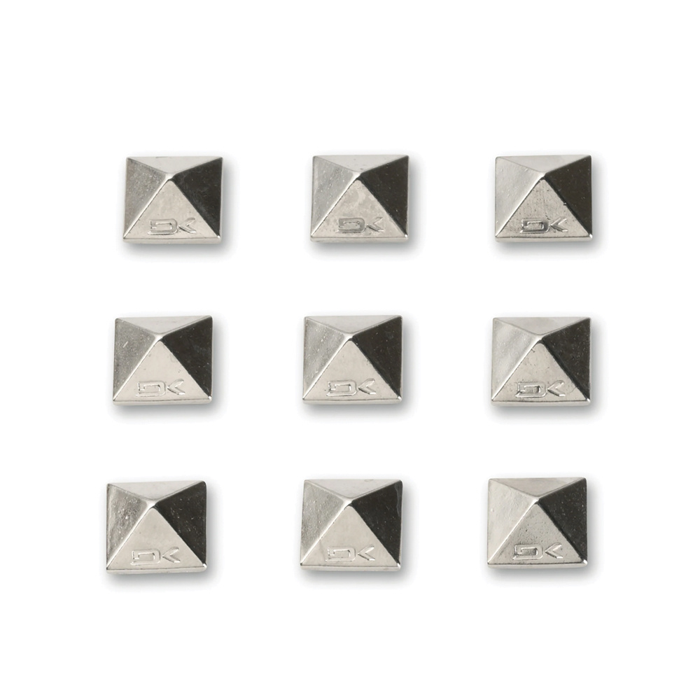 The Dakine Pyramid Studs give snowboarders dependable grip for their free foot without cluttering up board space. Made from sturdy plated aluminum, these studs install easily with a simple peel-and-stick adhesive backing, so you can personalize your setup in seconds. Each pack of 9 comes in black, brass, or chrome finishes, offering durability and style to match your ride. Compact, functional, and long-lasting, the Pyramid Studs are the perfect stomp solution when you need extra security on icy lifts or slick terrain.