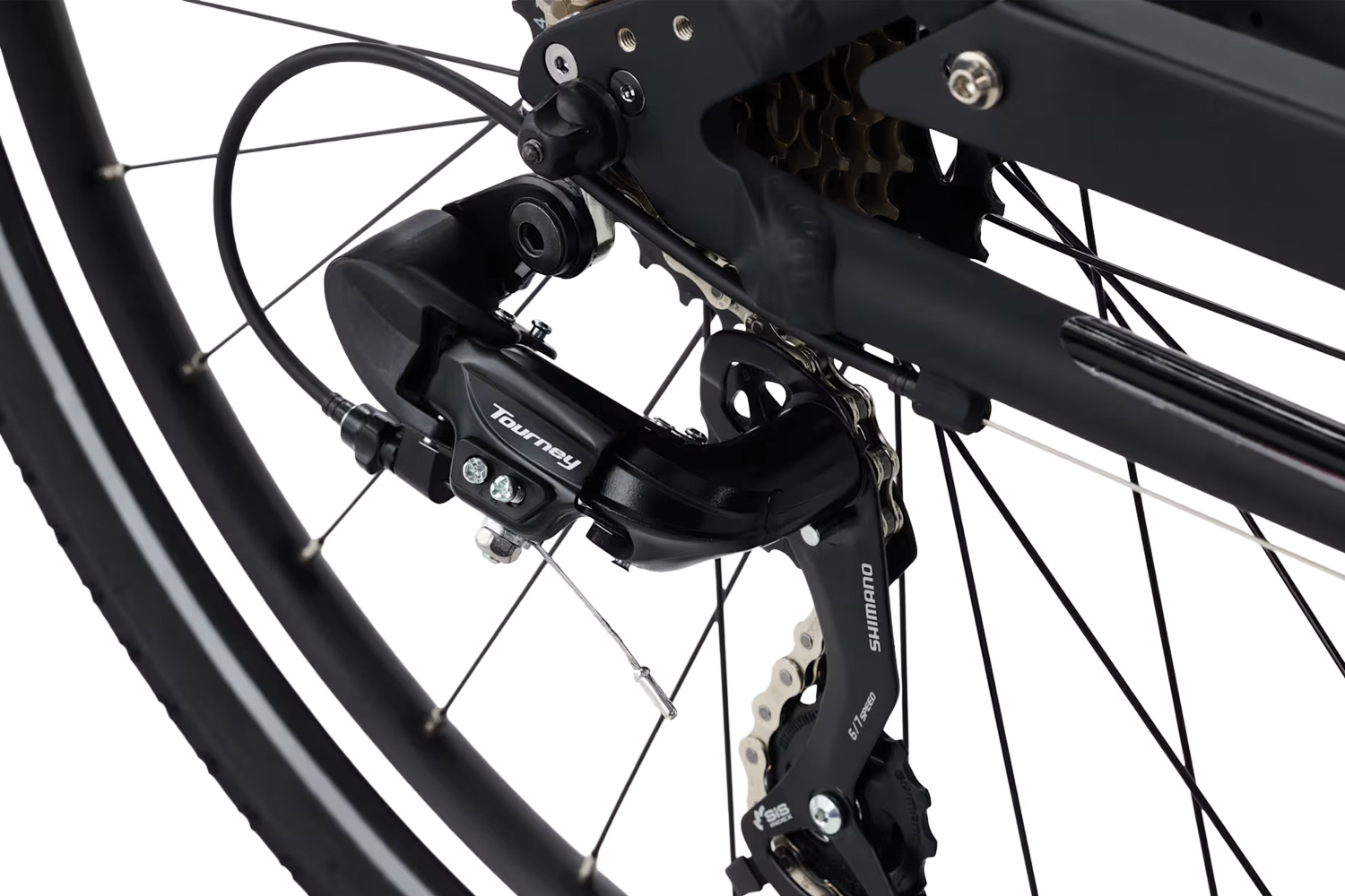Rear Derailleur: Shimano Tourney TY300 Crank: Forged alloy 170mm w/steel 44t chainring w/double chainguards Bottom Bracket:Square taper, loose ball Chain: KMC Z7, 7 speed Pedal: Resin platform w/non-slip tread |