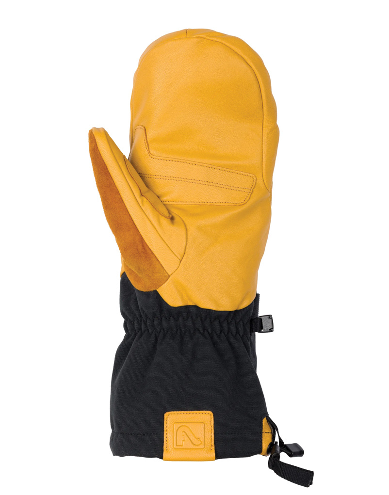 Leather pretreated with DWR for water resistant performance 10K/10K Waterproof lining Suede nose wipe Attachment clip Hang loop on finger Adjustable wrist strap and cinch for gauntlet |