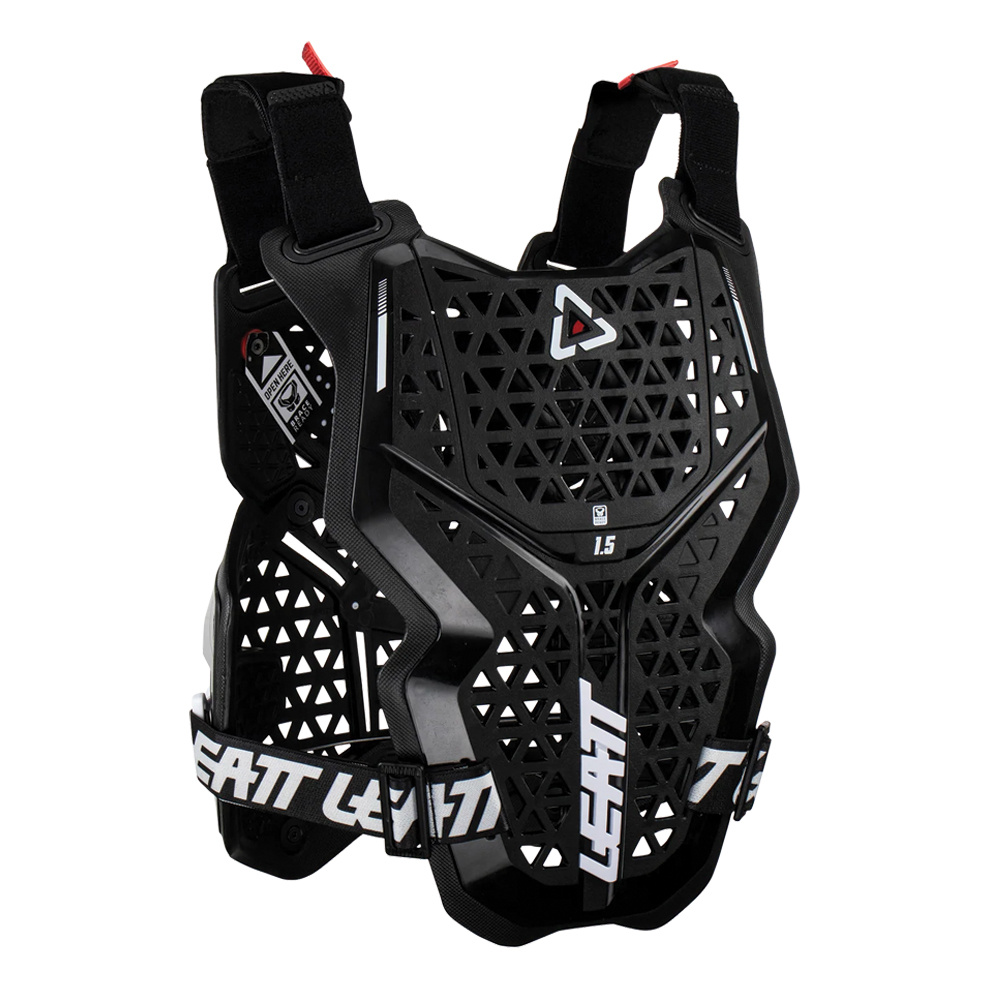 The Leatt Chest Protector 1.5 delivers chest, back, and roost protection with a lightweight hard shell and padded base layer. Removable plates, 3D ergonomic fit, and ventilation slots provide comfort and airflow, while the BraceOn system ensures seamless integration with a neck brace.