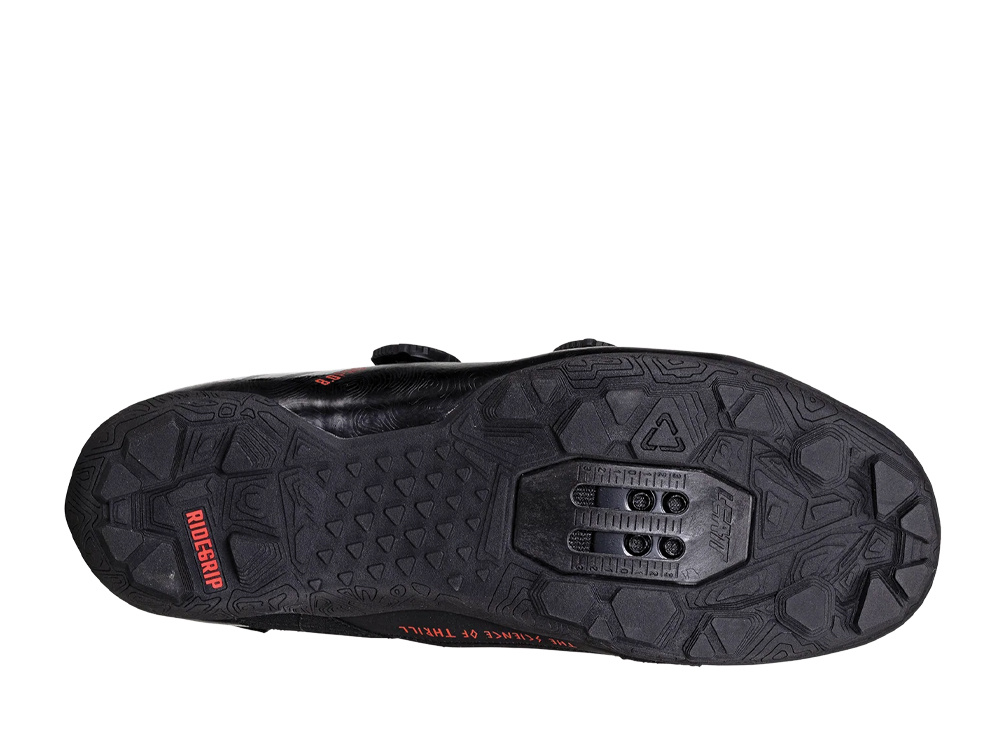 Upper: Lightweight Dyneema upper with TPU overlay for outstanding abrasion resistance Closure: Double MOZ/Leatt lacing system Leatt’s proprietary D-Ring allows the webbing strap to adjust automatically to any instep height Outsole: RideGrip rubber with aggressive tread pattern for great traction Shank: 20% carbon / 80% nylon injected shank = stiff & lightweight Insole: 2 sets of removable insoles: Wide (Blue EVA colour) and standard fit (Red EVA colour) Construction: Knitted tongue/collar fits feet like a sock • Directional fabric on heel to prevent heel slippage Stiffness: Level 8 Cleat Channels: Unique to Leatt, cleat channels extend towards the back of the shoe for a greater range of adjustment • Cleat shims included for pedal compatibility Weight: Approximately 360g per shoe (Size EU 43) |