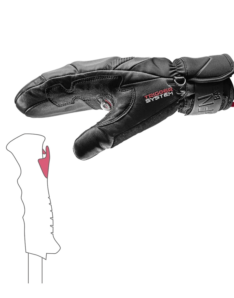 The back of the hand combines premium goatskin, softshell, and neoprene, while the 100% goatskin palm includes a Nash Silicone grip patch for a comfortable fit and reliable pole grip. Hyperloft insulation and Micro Bemberg lining offer superior protection against cold, keeping your hands warm during long days on the slopes. The Trigger 3D system allows instant clipping to your poles, ensuring efficient power transfer and precise control with every stroke.