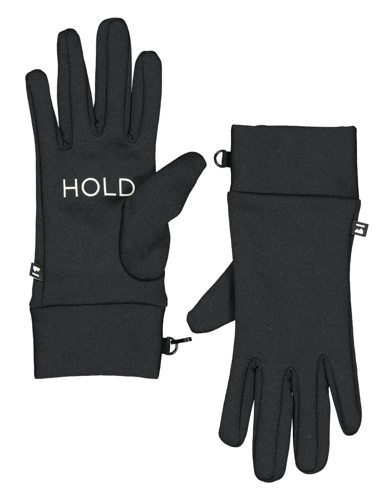 Durable polyester outer, brushed Merino interior Palm view reads "HOLD" / "TIGHT" Wide folded cuff with a joining clip |
