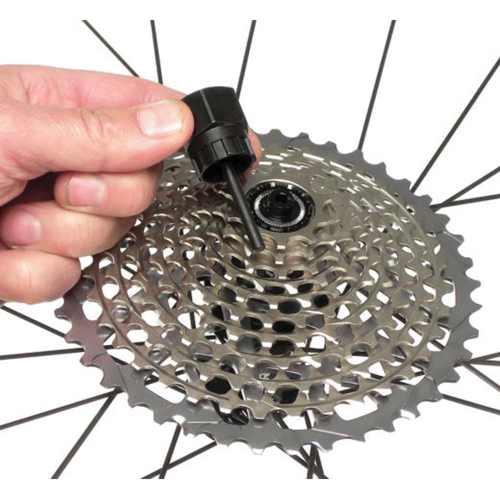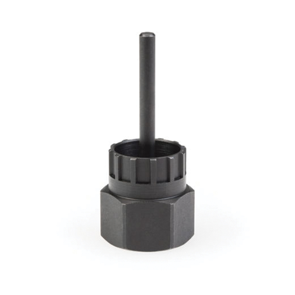 The Park FR-5.2G features a 5 mm guide pin for added stability when working with quick-release hubs. Compatible with Shimano®, SRAM®, and most 7-12 speed cassette lockrings, it also fits disc brake lockrings and adapters with 12 internal splines. Its thin wall design allows use without removing cones or locknuts. Made from heat-treated alloy steel with a 1" hex base, this tool is built to last a lifetime.