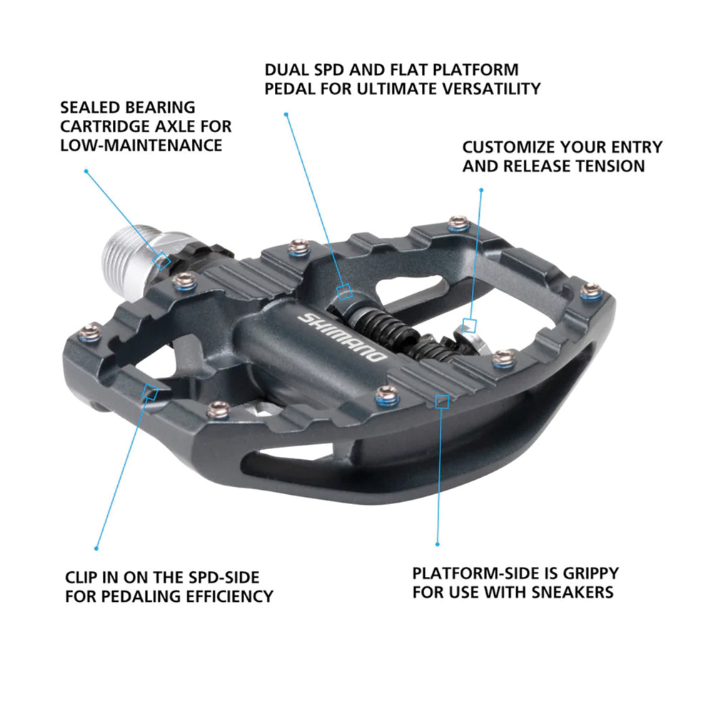 Use With Everyday Shoes or Clip-in Cycling Shoes: Platform pedal on one side and SPD pedal on the other. Adjustable Tension Settings: Customize the entry and release tension settings to make it easier or harder to clip in and out of the SPD pedal. Enhanced Grip: The platform side offers grip for control in all conditions. Durable and User-friendly: Low maintenance sealed cartridge axle unit. SM-SH56 SPD Cleats Included |