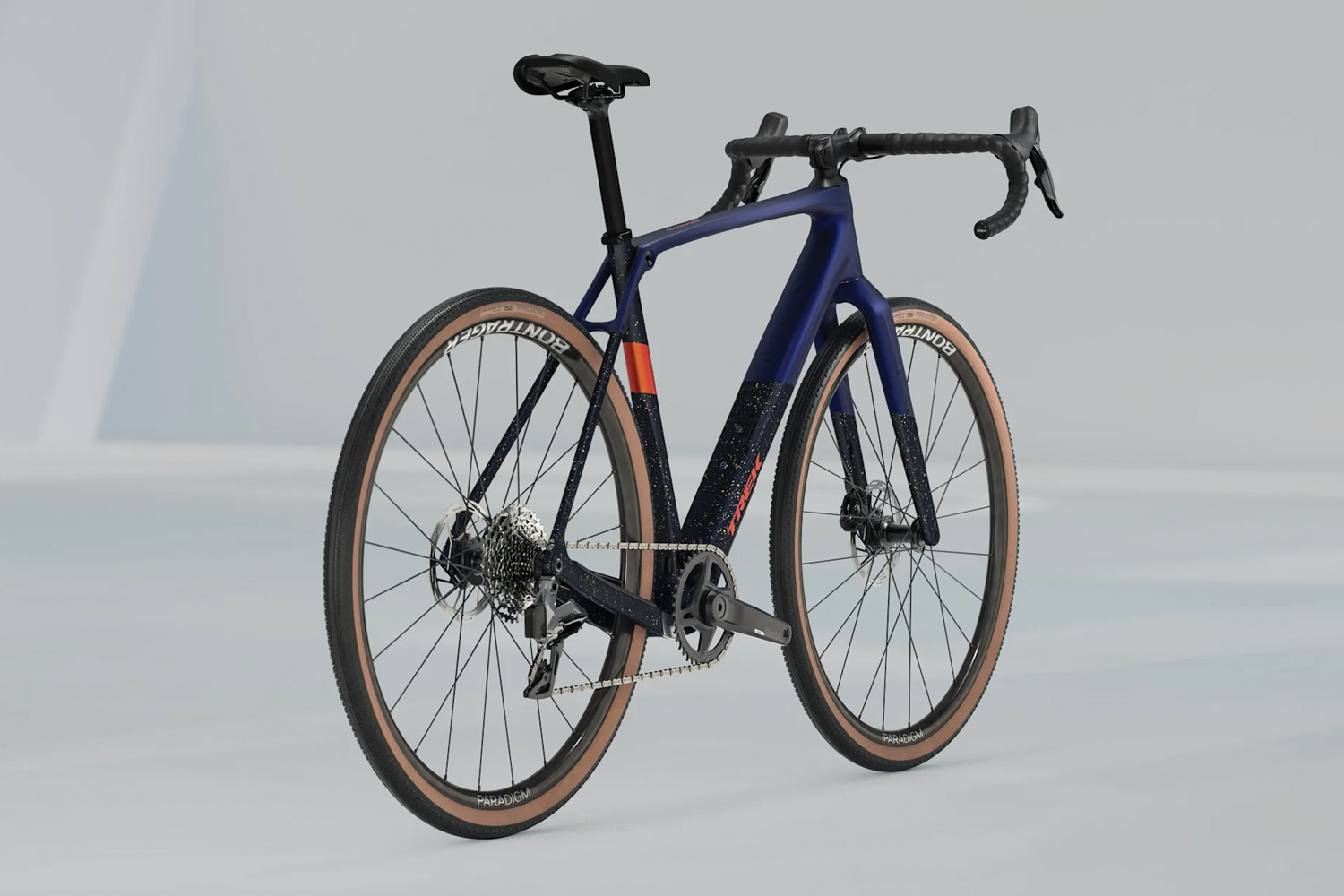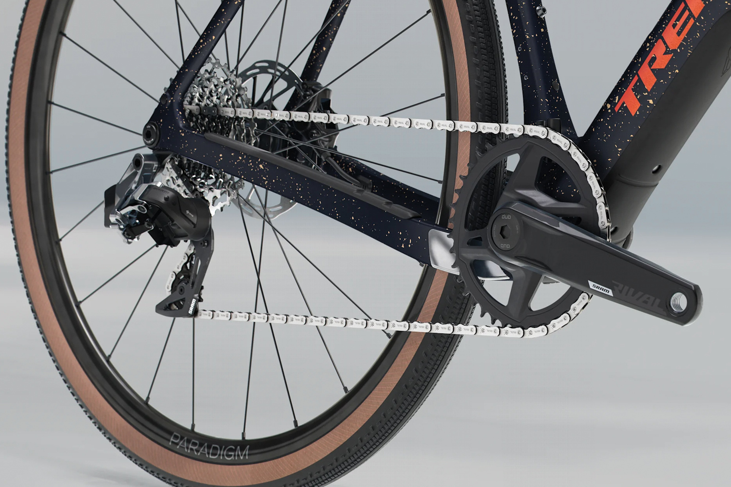 A 500 Series OCLV Carbon frame with a carbon fork, internal downtube storage, frame and fork mounts, and clearance for 50mm tires (as measured). A 12-speed 1x SRAM Rival AXS fully wireless drivetrain, hydraulic disc brakes, carbon seatpost, and Tubeless Ready Bontrager Paradigm Comp wheels with 42mm tires. |
