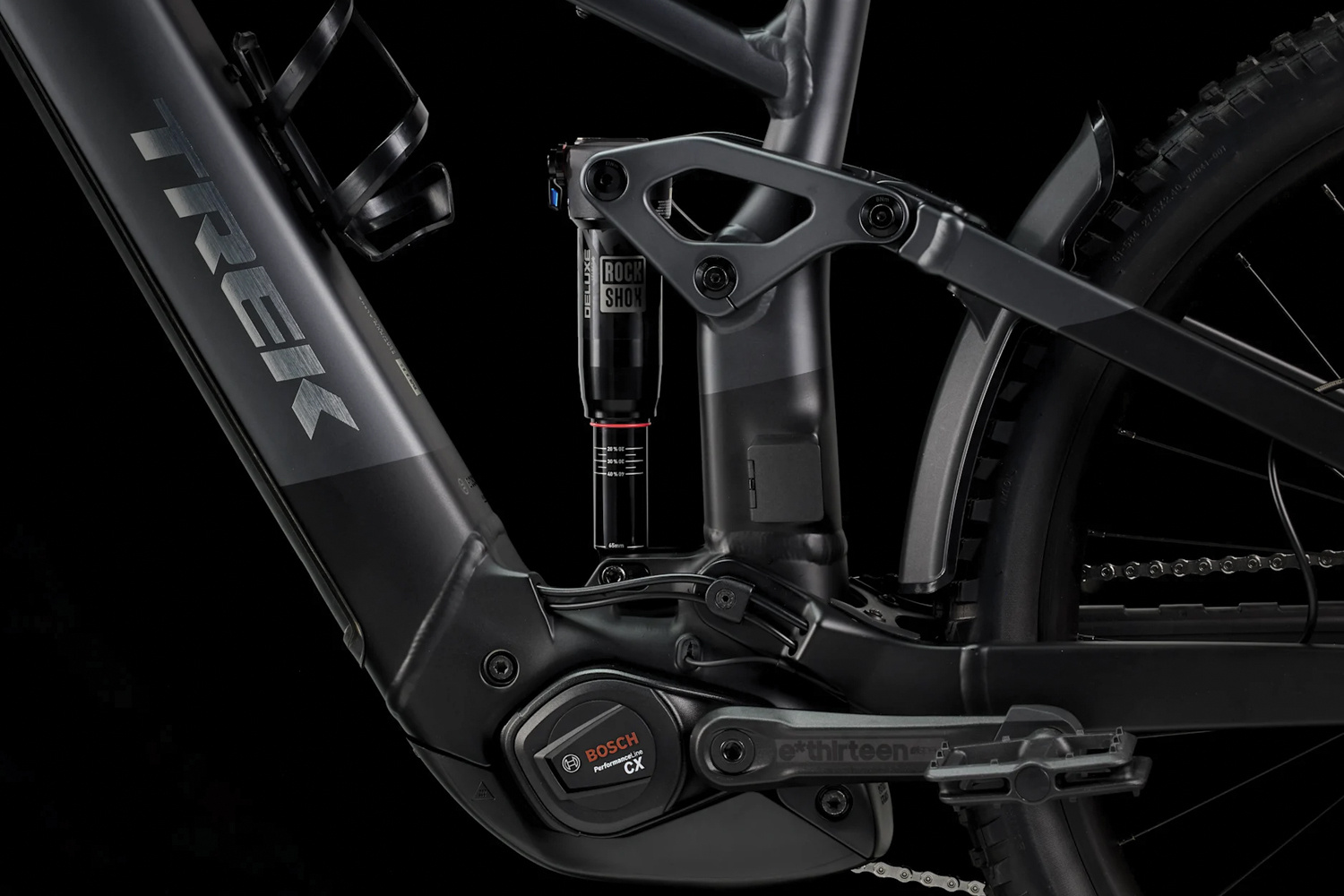 An Alpha Platinum Aluminum frame with a Bosch Performance CX system (85Nm, 250W), and 800Wh Removable Integrated Battery 2.0. A 160mm RockShox 35 Gold RL fork with DebonAir spring, Motion Control damper with lockout, and a RockShox Deluxe Select+ RT shock. All topped off with a Shimano Deore 12-speed drivetrain, dropper post, Tubeless Ready Bontrager Line wheels, and 4-piston hydraulic disc brakes. |